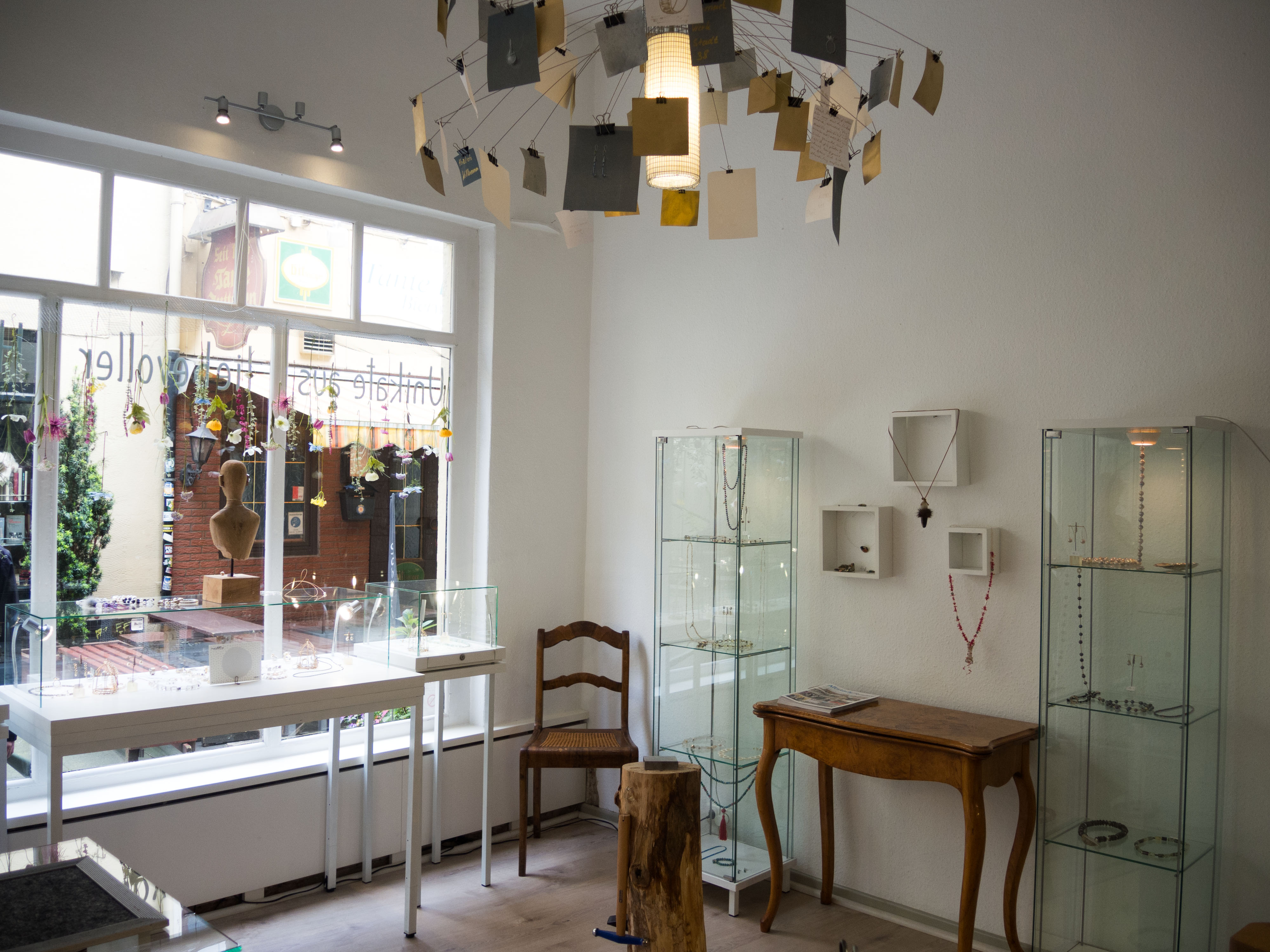 „Unikate aus liebevoller Hand“ lautet der Slogan der Schmuckwerkstadt38, der gut leserlich am Schaufenster des Lädchens im Handelsweg geschrieben steht. Inhaberin Birgit Achilles sitzt an ihrem Werktisch und tüftelt gerade an einem ihrer Schmuckstücke, als ich das Geschäft betrete. In den Glasvitrinen liegt, all das, was ein Schmuckliebhaberherz begehrt: Ketten, Ohrringe, Ringe und Armbänder gehören zum Sortiment. Diese sind aus Gold und Silber und teilweise mit edlen Steinen verziert. „Setzen Sie sich gerne“, sagt Birgit Achilles und ich nehme neben ihr Platz.