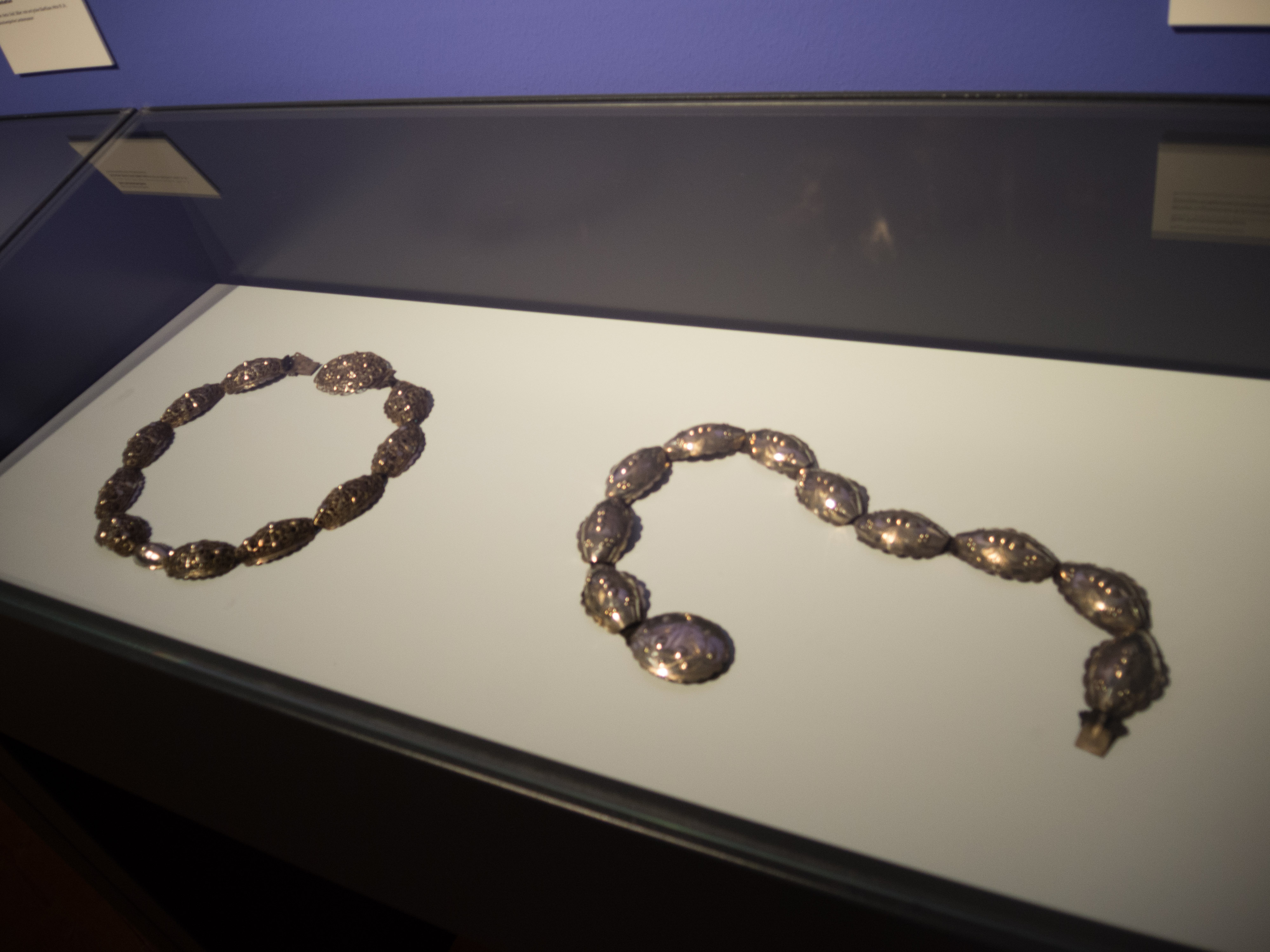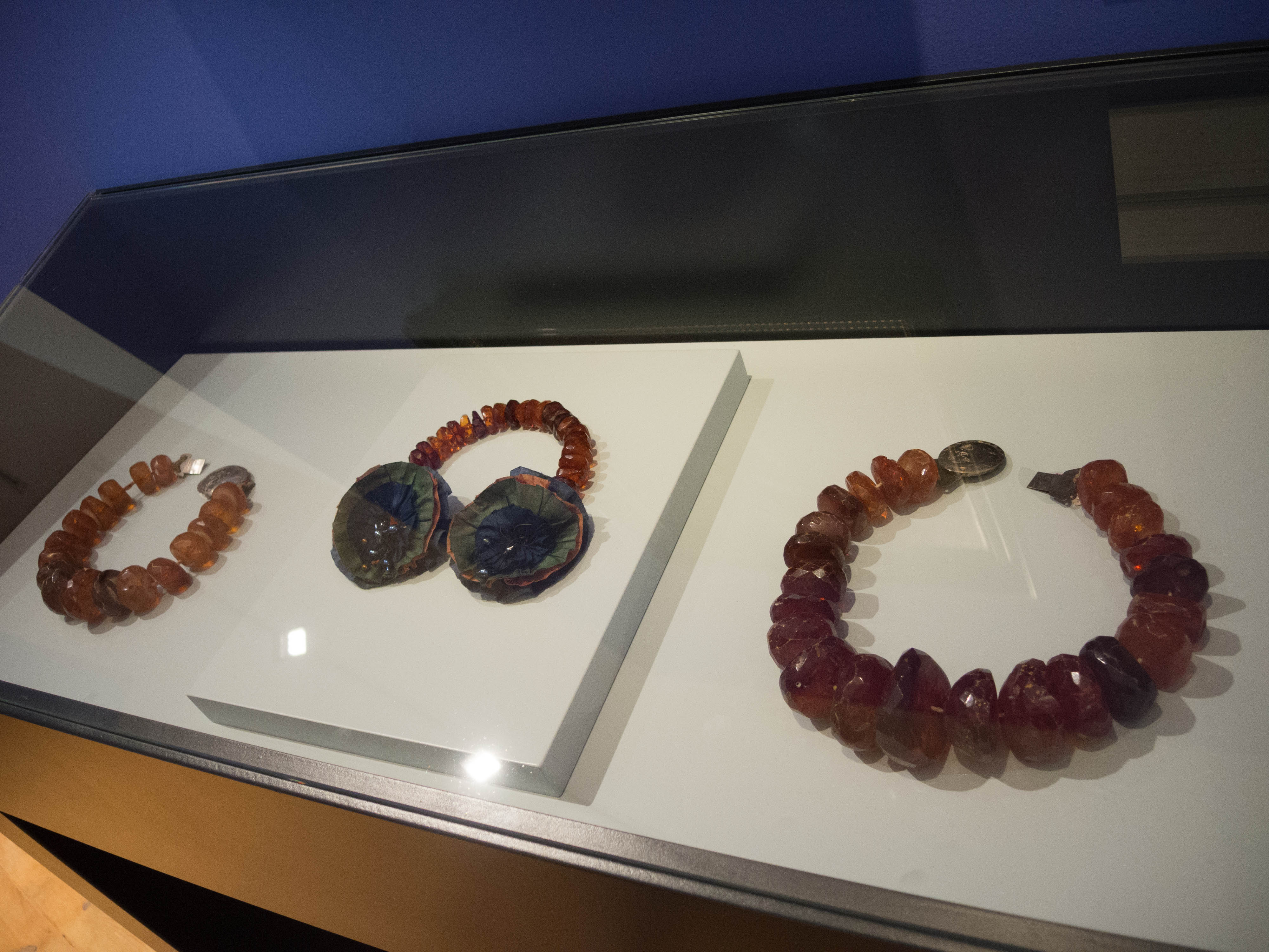 Eine regionale Besonderheit ist der Bohnenschmuck. „Er heißt so, weil die einzelnen Elemente bohnenförmig sind“, erklärt mir die Projektleiterin. Die Glieder sind aus Silberblech oder Silberfiligran gearbeitet und teilweise vergoldet. „Man hat den Bohnenschmuck Mitte des 18. Jahrhunderts gerne mit Trachten kombiniert. Um 1860, mit dem Niedergang der Trachten, wurde auch der Bohnenschmuck nicht mehr getragen“, erklärt Dominique Ortmann. Weit verbreitet in der Löwenstadt war zu dieser Zeit auch der Bernstein. Die bis zu fünf Zentimeter dicken Steine wurden poliert oder mit Facettenschliff versehenen und auf einen Faden aufgezogen. An einer Mitmachstation kann ich mir sogar meinen eigenen Bernstein nach Belieben zurecht schleifen und auf eine Kette fädeln.