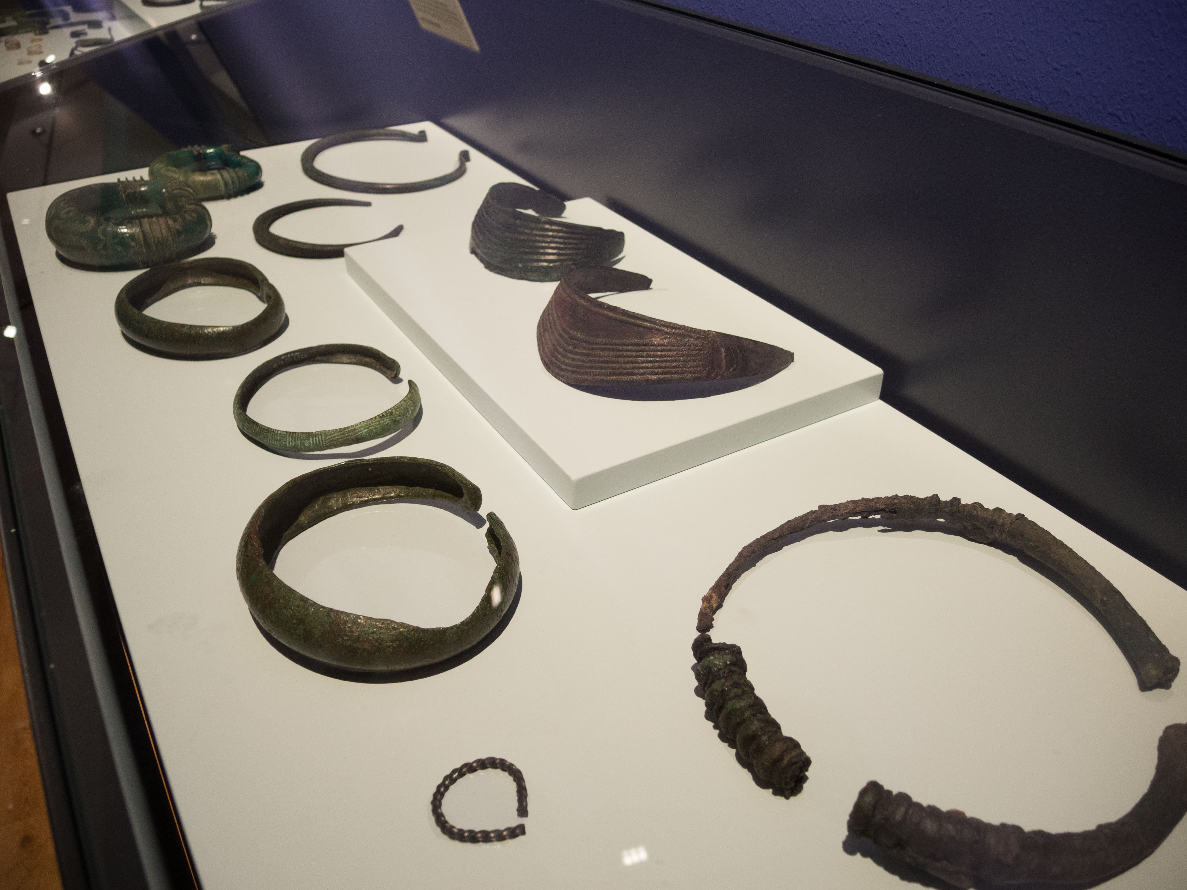 „Bereits vor 40.000 Jahren schmückten sich die Menschen mit Kleidung und Accessoires, frisierten sich, benutzten Parfüms oder trugen gar Tattoos“, erzählt mir Dominique Ortmann. „Schönheit galt damals als Indiz eines guten Charakters. Jemandem, der nicht dem aktuellen Schönheitsideal entsprach, wurde schnell ein schlechter Charakter zugeordnet“, fügt sie hinzu. Wir befinden uns im ersten Ausstellungsraum. Das Licht ist angenehm gedimmt, nur die Vitrinen mit Schmuckstücken und Pflegeaccessoires sind hell beleuchtet. Schon in der immer ging von Schmuck eine Faszination aus. Kein Wunder, ist er doch wunderbar zeitlos. Das ein oder andere Ausstellungsstück, könnte durchaus auch in modernen Modeläden zu finden sein. Die Ringe und Armbänder sind aus den einfachsten Materialien gefertigt und doch unterscheiden sie sich in ihrer Grundform kaum von den heutigen, außer, dass sie mal mehr oder weniger verziert waren. Während der Schmuck im 17. Jahrhundert eher schlicht war, trug man ihn ab dem 18. Jahrhundert gerne aufwendig verziert und um das 19. Jahrhundert galt die Devise: je auffälliger, desto besser. Jedoch konnte sich nicht die gesamte Bevölkerungsschicht damit schmücken. Wir kommen vorbei an einer Vitrine mit Geschmeide, Kleiderbürsten und Schminkutensilien aus dem Paris des 19. Jahrhunderts. Die Ausstellungsstücke sind vergoldet und mit Miniaturmalereien versehen. „Diese Exemplare waren den etwas betuchten Leuten vorbehalten, die normalen Bürger konnten sich diesen Luxus nicht leisten“, erzählt mir Dominique Ortmann.