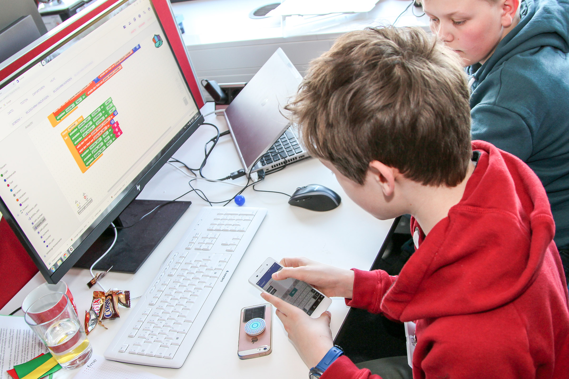 „Programmieren steht bei uns in der Schule leider nicht auf dem Stundenplan. Nur ein bisschen Powerpoint und so“, erzählt mir Linus (12), während er am Rechner eifrig die bunten Code-Bausteine seiner Smartphone-App anordnet – und zeigt damit sowohl den Wert des Digital-Camps als auch die grundlegende Schwachstelle in Teilen der deutschen Bildungslandschaft. Denn auch wenn er aus Spaß hier ist und die Erfahrung sichtlich genießt, nutzt der Sechstklässler letztlich seine freie Osterferienzeit, um sich fortzubilden. So auch sein Freund Ken (13), der bereits zum zweiten Mal hier ist: „Ich will zwar kein Programmierer werden, aber man kann sowas heute einfach überall gebrauchen, egal ob im Beruf oder zuhause.“ Der Achtklässler hat dabei seinen Vater zum Vorbild, der gelegentlich kleine Gadgets für den Haushalt programmiert, um den Alltag der Familie zu erleichtern.