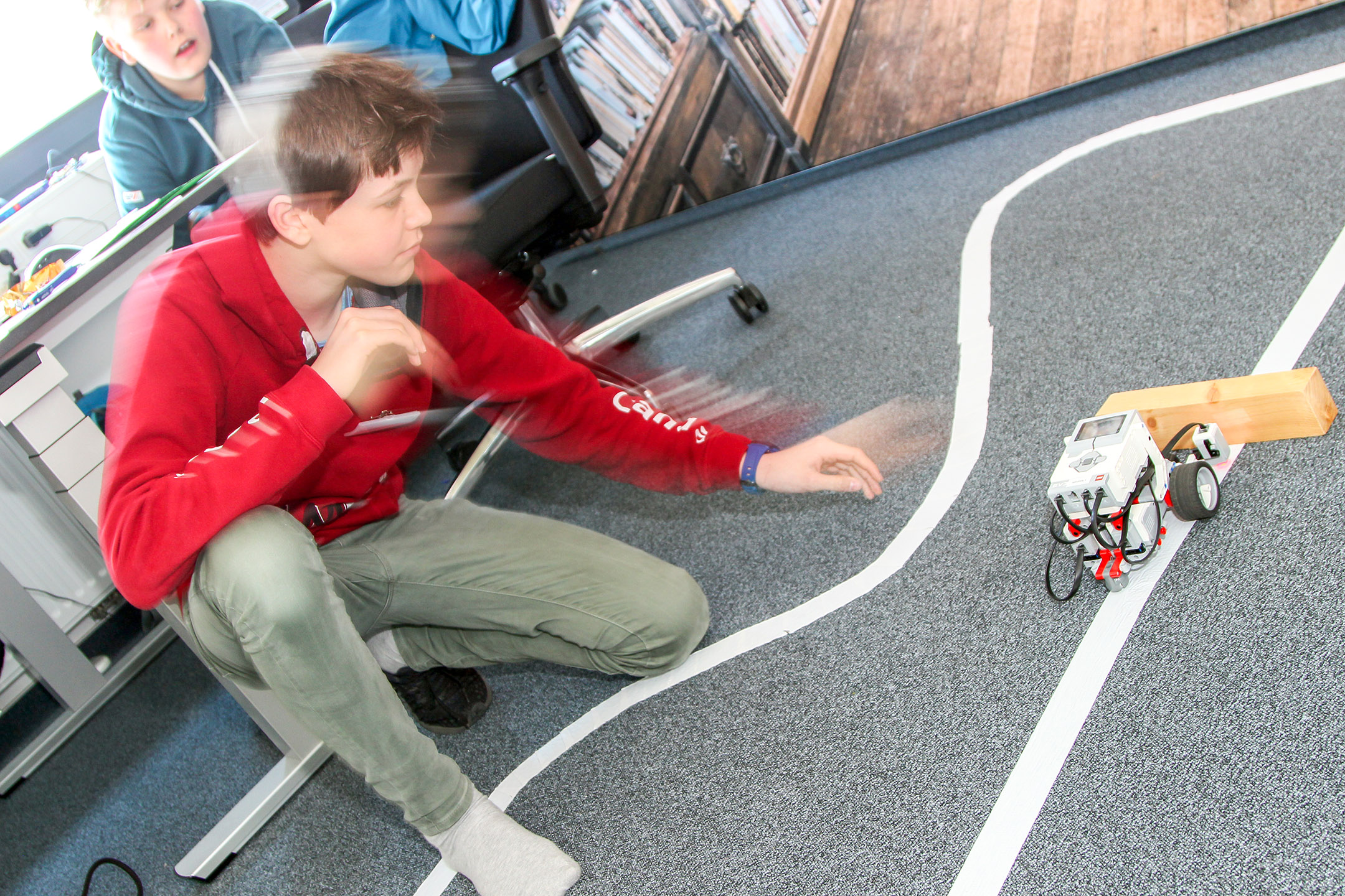 Linus (links) und Ken mit ihrem selbstfahrendem Roboter-Fahrzeug. Foto: Steffen Dietl
